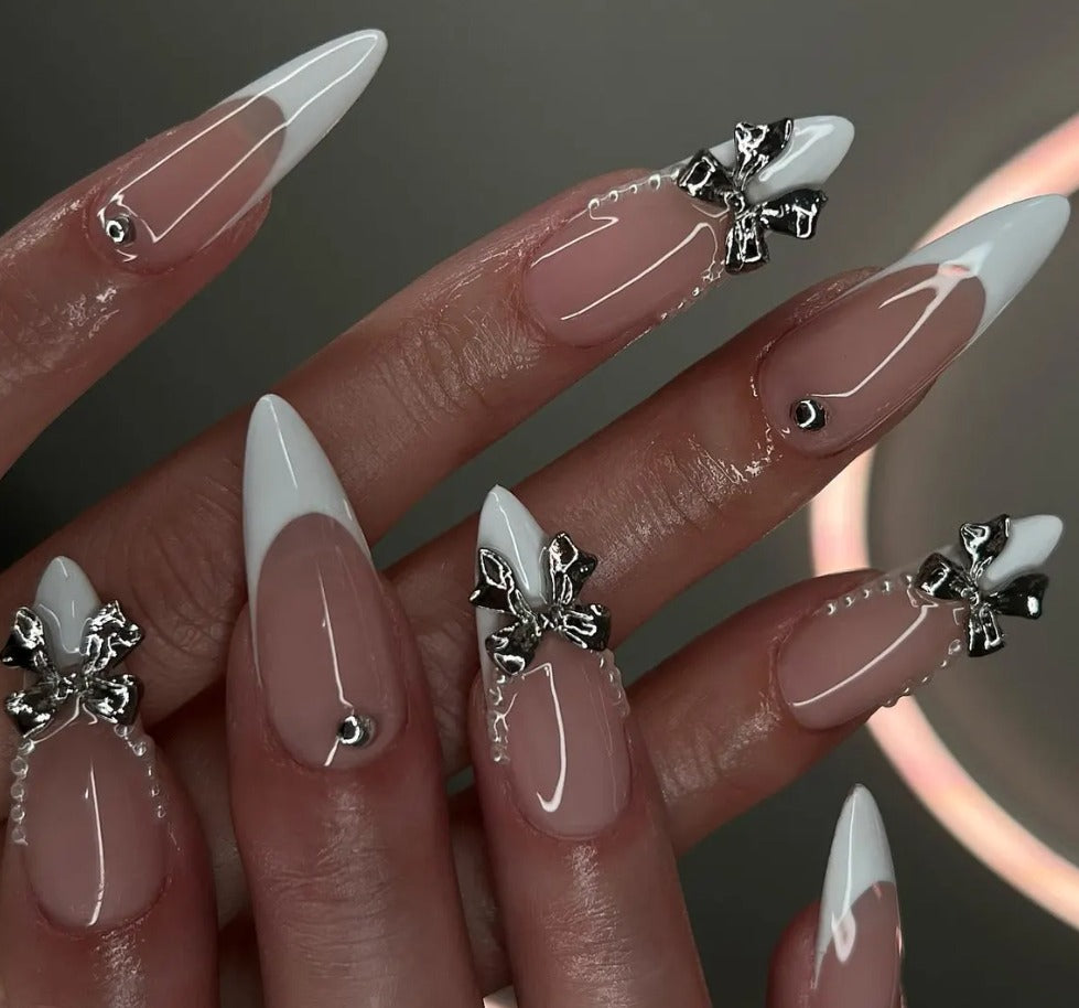 ✨ French "Silver Bow Opulence" Press-On Nails ✨ Elevate the classic French manicure with a touch of modern luxury using...