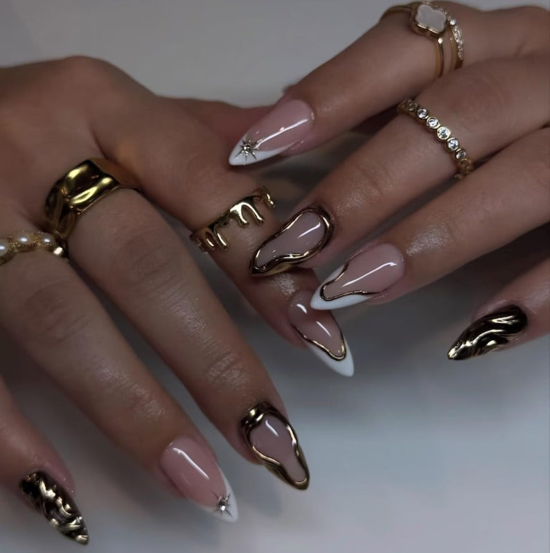 ✨ French "Liquid Gold" Press-On Nails ✨ Reimagine the classic French manicure with a bold, modern edge using our French...